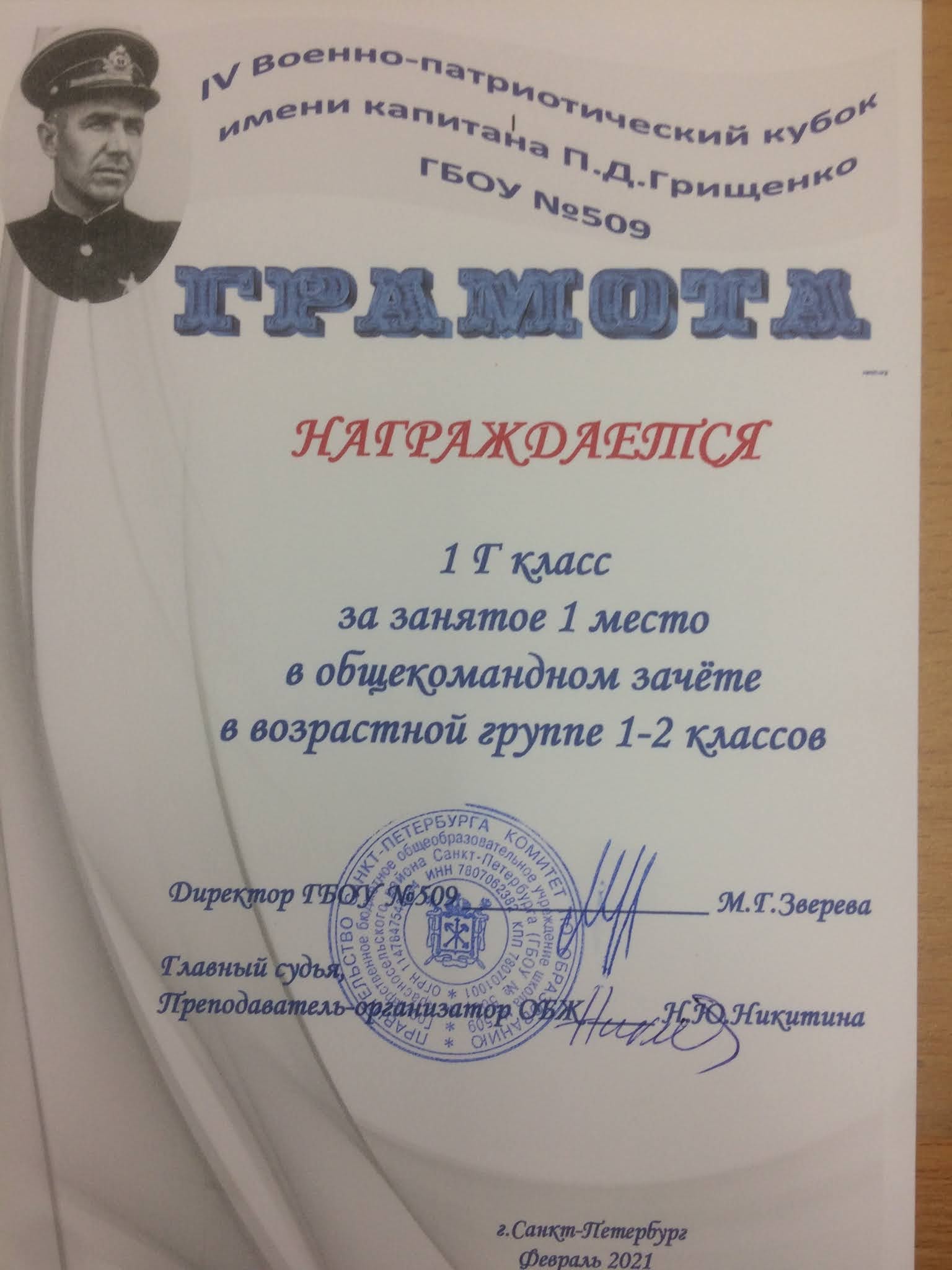 Подведены итоги. Ребята, спасибо всем за участие! Поздравляю победителей и призёров конкурсов! Благодаря победам Миланы, Александра Б., успешному выступлению класса в конкурсе строевой песни мы завоевали кубок имени капитана П.Д. Грищенко. МОЛОДЦЫ! Спасибо и вашим родителям!